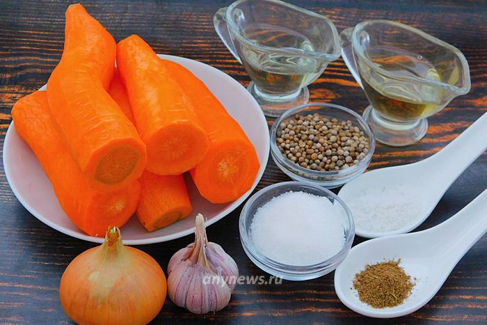 Подготовить все необходимое для корейского салата из моркови. Морковку, лук и чеснок очистить.